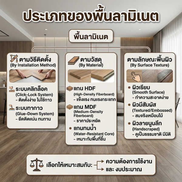 พื้นลามิเนตคือ วัสดุที่มีหลายประเภทแยกตามวิธีติดตั้ง วัสดุ และลักษณะพื้นผิว การเลือกประเภทพื้นลามิเนตที่เหมาะสม จะให้ผลลัพธ์ตามความต้องการใช้งานและงบที่มี