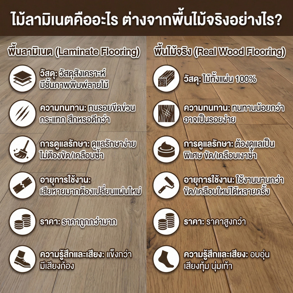 - วัสดุ พื้นไม้จริงผลิตจากไม้ทั้งแผ่น 100% ขณะที่พื้นลามิเนตคือชั้นภาพพิมพ์ลายไม้เท่านั้น ส่วนชั้นอื่นทำจากวัสดุสังเคราะห์หรือไม้อัด