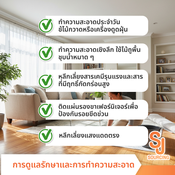 - ทำความสะอาดประจำวัน ใช้ไม้กวาดหรือเครื่องดูดฝุ่นเพื่อกำจัดฝุ่นละออง
