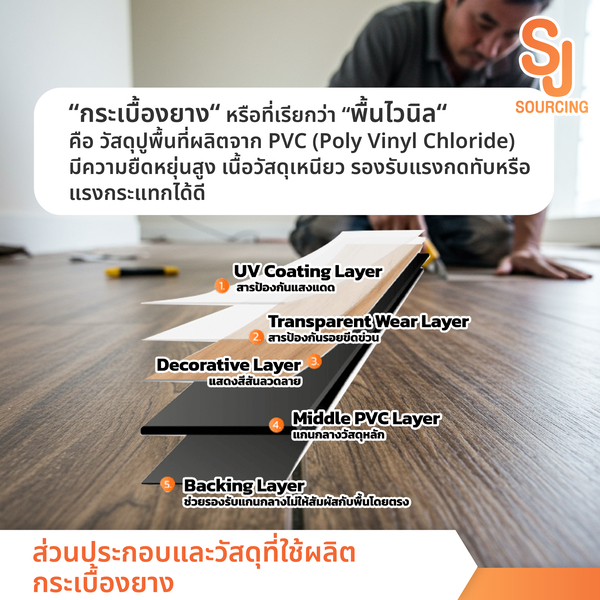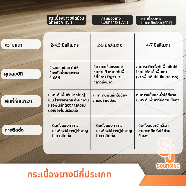 - มี 3 ประเภทหลัก ได้แก่ กระเบื้องยางแบบทากาว (LVT) แบบคลิกล็อก (SPC) และชนิดม้วน (Sheet Vinyl)