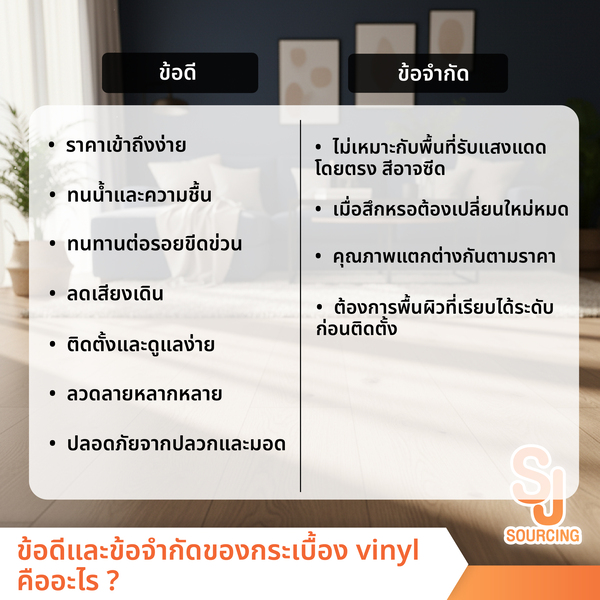 การเลือกใช้พื้นไวนิลมีทั้งข้อดีและข้อจำกัดที่ควรพิจารณาก่อนตัดสินใจ ดังนี้ค่ะ