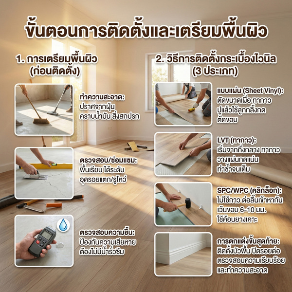 - ขั้นตอนการติดตั้งและเตรียมพื้นผิวสำหรับปูพื้นไวนิล