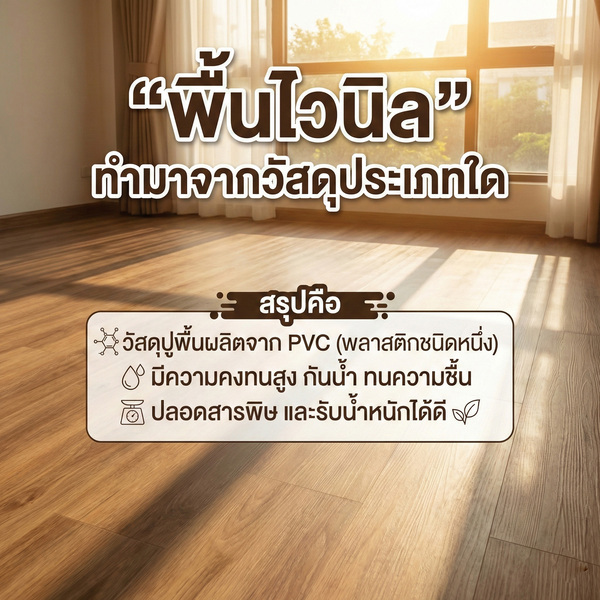 - พื้นไวนิลคือ วัสดุปูพื้นที่ผลิตจาก PVC (Polyvinyl chloride) มีความทนทาน กันน้ำ ดูแลง่าย