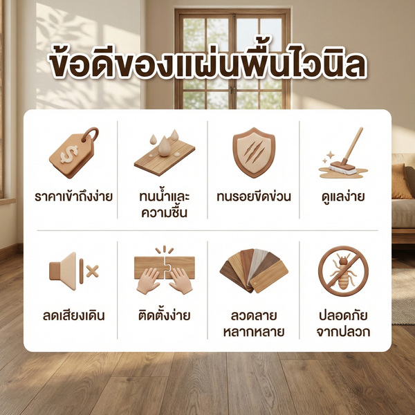 - ข้อดีหลัก คือ ราคาถูกกว่าไม้จริง ทนน้ำ ทนปลวก ลดเสียงเดิน ติดตั้งง่าย มีลวดลายสวยเหมือนไม้จริง