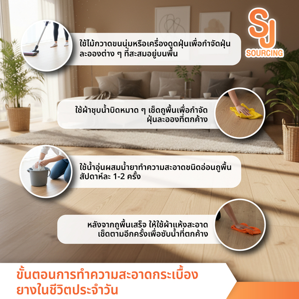 การทำความสะอาดกระเบื้องยาง ช่วยดูแลให้กระเบื้องคงความสวยงามและยืดอายุการใช้งานของกระเบื้องยางให้นานขึ้น ปัจจุบัน กระเบื้องยาง เป็นตัวเลือกที่หลายบ้านชื่นชอบสำหรับตกแต่งพื้น ด้วยคุณสมบัติทนทาน กันน้ำ กันปลวก และมีลวดลายสวยงามหลากหลาย บทความนี้ S.J.Sourcing จะแนะนำวิธีดูแลกระเบื้องยางอย่างถูกต้องเพื่อยืดอายุการใช้งานให้นานที่สุดค่ะ