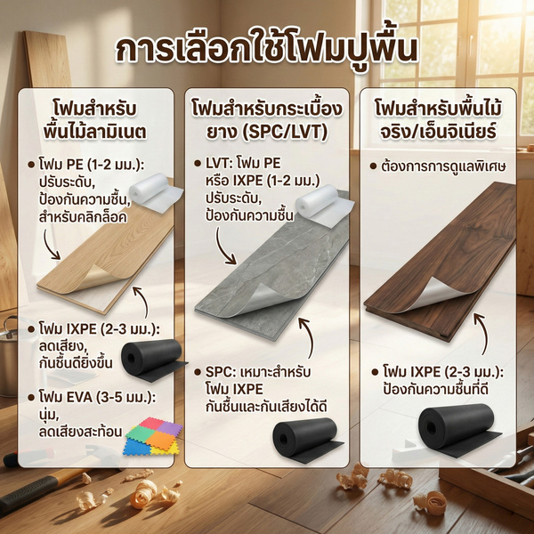 ควรเลือกประเภทโฟมปูพื้นให้เหมาะกับวัสดุปูพื้น เช่น ใช้โฟม PE สำหรับพื้นไม้ลามิเนต และ IXPE สำหรับกระเบื้องยาง SPC