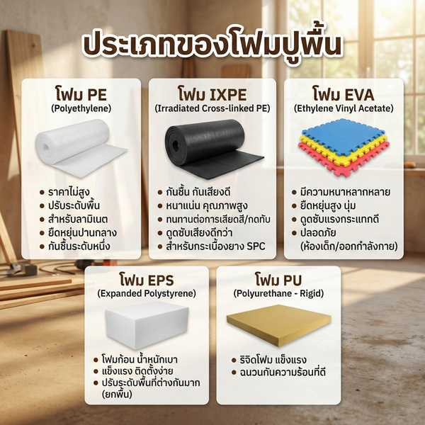 - โฟมรองปูพื้นที่ใช้กันแพร่หลายมี 2 ประเภทหลัก ได้แก่ PE (Polyethylene) และ IXPE (Irradiated Cross-linked Polyethylene)