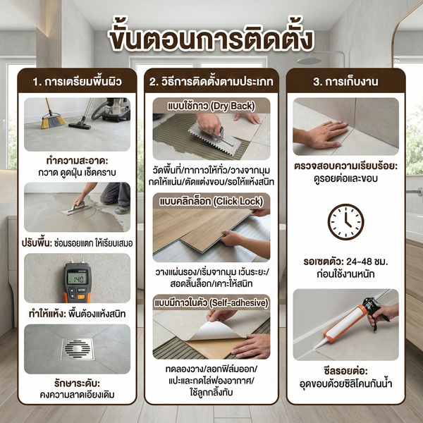 - ระบบติดตั้งหลักมี 2 แบบ แบบใช้กาว (Dry Back) และแบบคลิกล็อค (Click Lock)