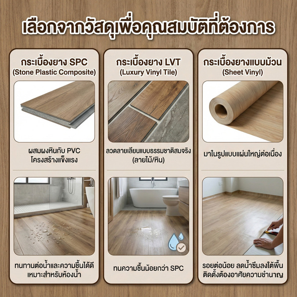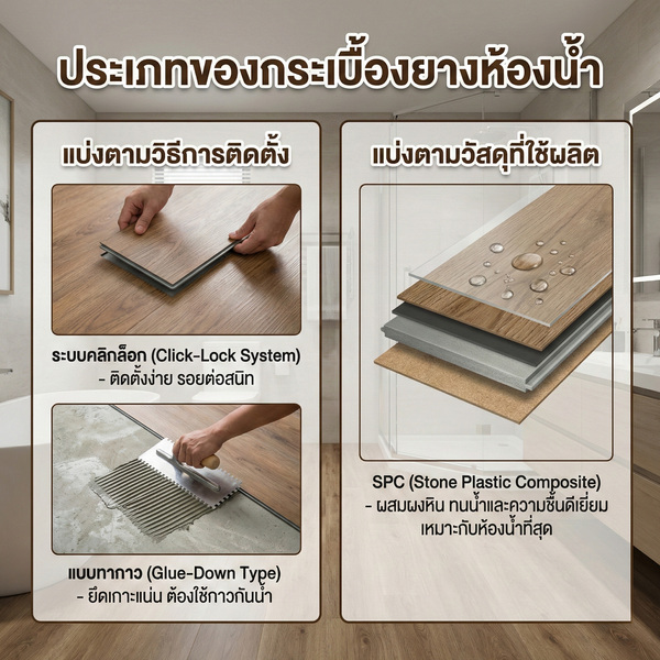 - กระเบื้องยางปูห้องน้ำ แนะนำให้ใช้ประเภท SPC ที่กันน้ำได้ดีและทนความชื้นสูง