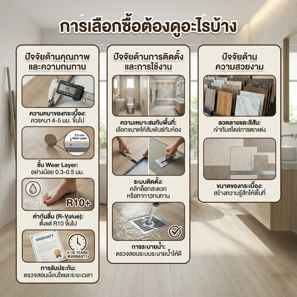 การเลือกซื้อกระเบื้องยางปูห้องน้ำให้ถูกใจและใช้งานได้นานนั้น มีรายละเอียดที่ควรพิจารณาหลายส่วน เพื่อให้ได้พื้นที่ทนทานต่อความชื้นและตอบโจทย์การใช้งานของทุกคนในบ้าน มีดังนี้