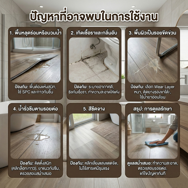 เพื่อป้องกันปัญหาน้ำรั่วซึม ควรเลือกระบบติดตั้งที่ปิดรอยต่อได้สนิท เช่น ระบบคลิกล็อกที่ออกแบบมาเพื่อกันน้ำ หรือการติดตั้งแบบใช้กาวที่ปูได้แนบสนิทกับพื้น