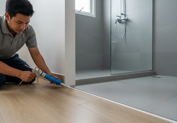 ซีลรอยต่อ (ถ้าจำเป็น) สำหรับบางพื้นที่ สามารถใช้ซิลิโคนกันน้ำหรือวัสดุยาแนวอุดตามขอบห้องและรอยต่อต่าง ๆ เพื่อป้องกันน้ำซึมลงใต้พื้นกระเบื้อง