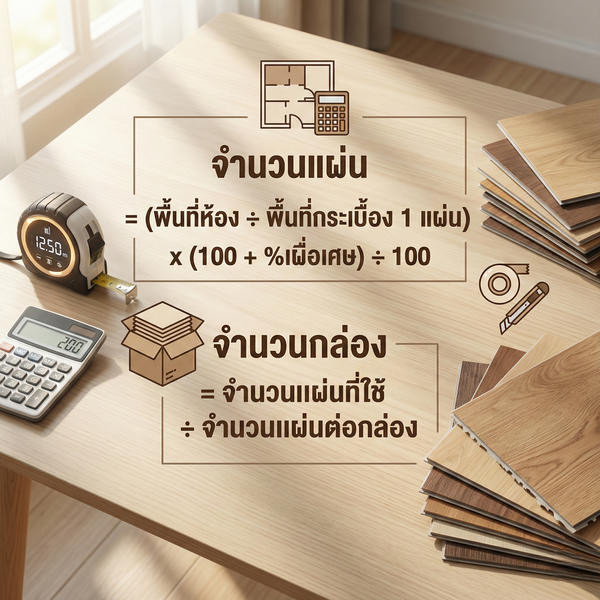 - ควรเผื่อเศษ 5-15% ขึ้นอยู่กับรูปแบบการปูและความซับซ้อนของห้อง