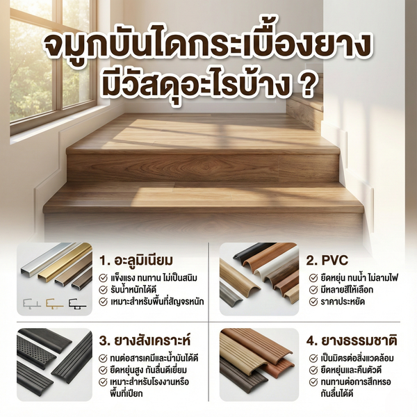 จมูกบันไดที่ใช้งานกับกระเบื้องยางผลิตจากวัสดุหลายชนิด แต่ละชนิดก็มีคุณสมบัติ ความทนทาน และราคาที่แตกต่างกัน การทำความเข้าใจคุณสมบัติของวัสดุแต่ละแบบ ช่วยให้เลือกใช้งานจมูกบันไดกระเบื้องยางได้ตรงกับความต้องการและพื้นที่ติดตั้งค่ะ