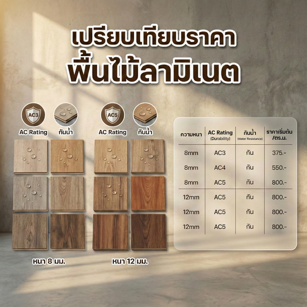 - ค่า AC Rating หรือ Abrasion Class บอกความทนทานต่อรอยขีดข่วน AC3 เหมาะกับบ้านทั่วไป AC4 สำหรับพื้นที่เดินมาก และ AC5 สำหรับเชิงพาณิชย์