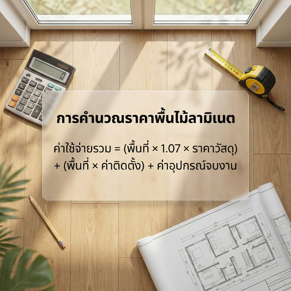 สูตรคำนวณพื้นฐาน ค่าใช้จ่ายรวม = (พื้นที่ × 1.07 × ราคาวัสดุ) + (พื้นที่ × ค่าติดตั้ง) + ค่าอุปกรณ์จบงาน